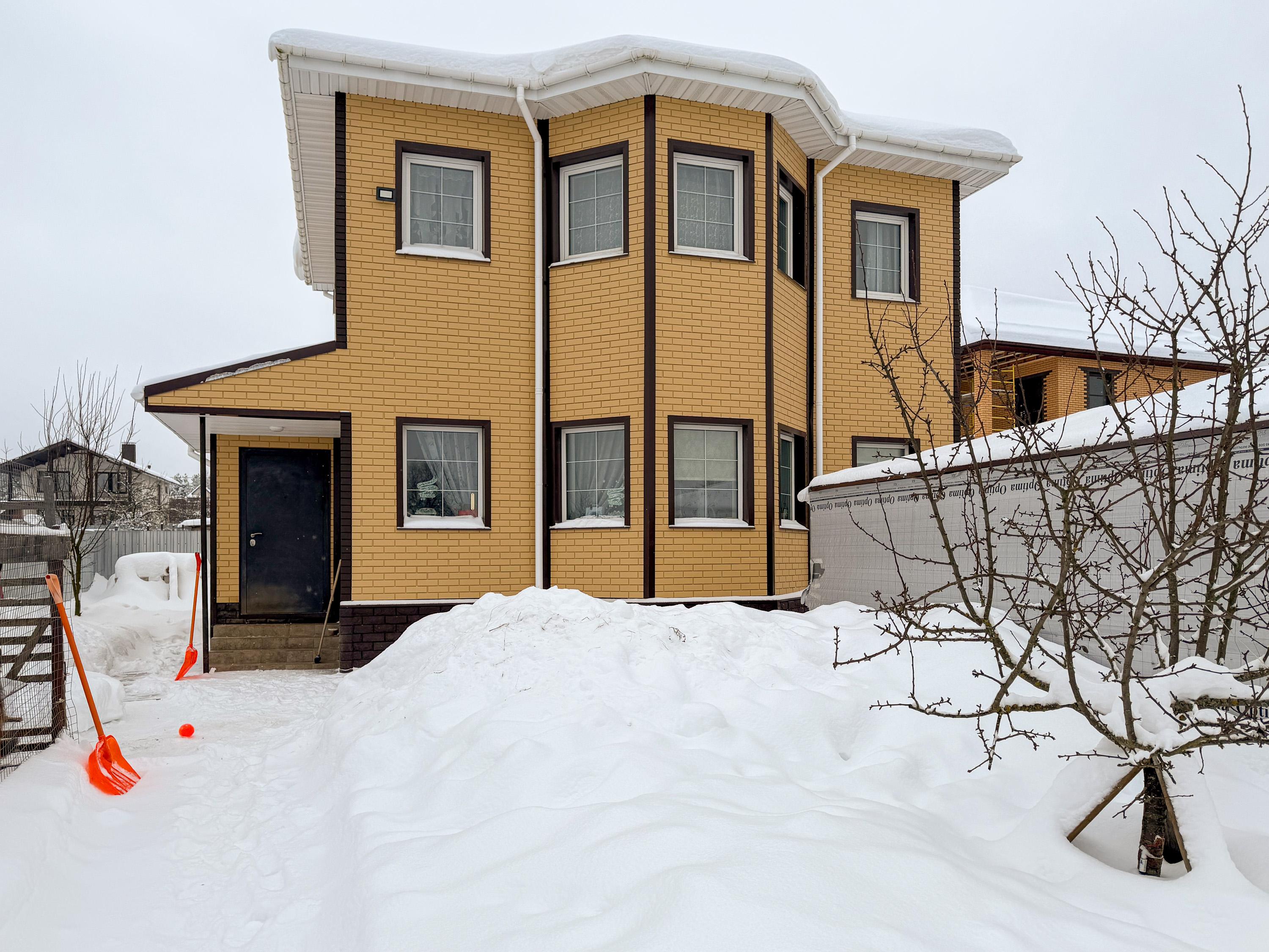 Дом облицован клинкерной плиткой (теплопанели), крыша — мягкая кровля. Качественное и тёплое строение, подходит для круглогодичного проживания.