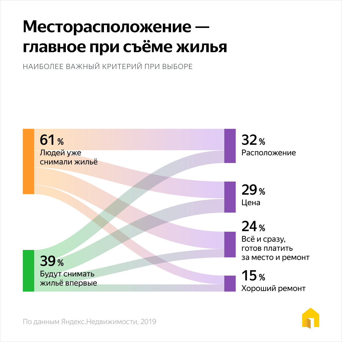 Основной причиной для переезда служит неудобное месторасположение квартиры. Люди хотят жить поближе к работе или улучшить транспортную доступность. Среди «опытных» квартиросъёмщиков преобладают семьи, они готовы платить больше за хорошее состояние квартиры и транспортную доступность района. Только 25% называют цену важнейшим критерием при выборе квартиры, а 13% готовы снимать жильё подальше и подороже, но в хорошем состоянии.
